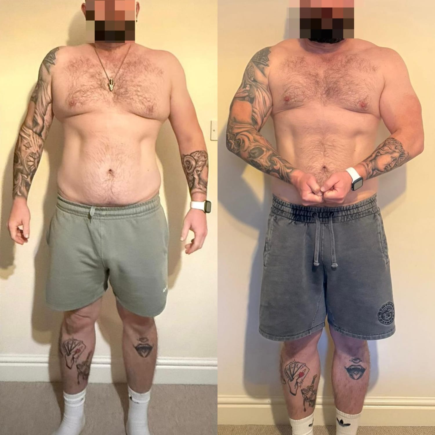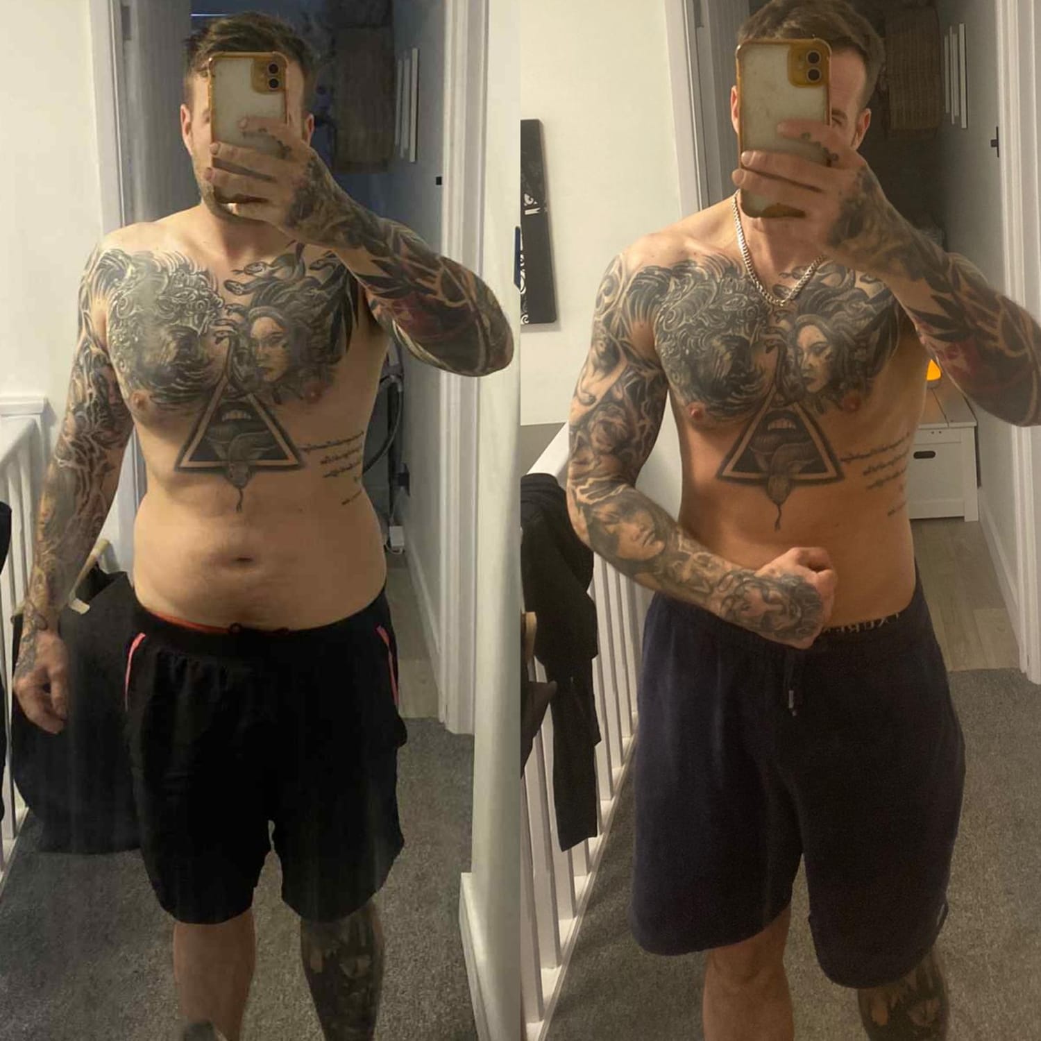 Jay: Primary goal has been weight loss, and as you can see this has been been achieved! Our focus has been on retaining as much muscle mass as possible whilst dropping the excess body fat. He now has a LOT less fat, and is gaining great shape in the muscles that are being uncovered.